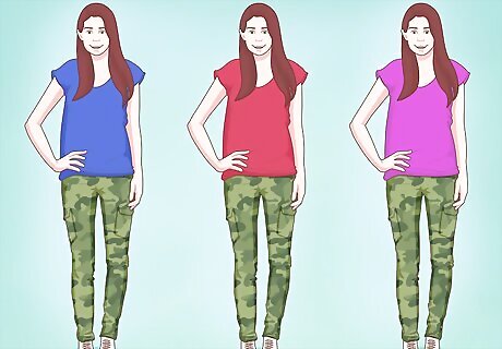Brighten your outfit by pairing your camo with a saturated hue. Camo may be a bold look, but you can brighten it up even further by pairing it with a saturated top. Go for colors rich in pigment like royal blue, crimson, or magenta. You can wear T-shirts, long-sleeve shirts, blouses, button-downs, or sweaters in bold colors. These may not “match” your camo pants, but they still go together because the camo almost acts as a neutral.