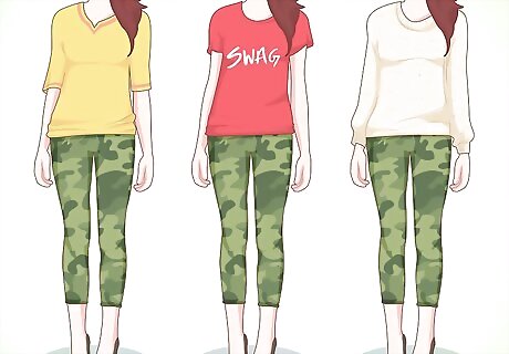 Go with black and grey tops for a neutral yet stylish outfit. You can wear either all black or all grey with your camo, or go with a mix of both. Black clothing looks classic paired with camo pants, and a touch of grey pairs lovely as well. These tones add some softness to camo’s loud print. Go with a grey T-shirt or tank, and wear a black sweater over top, for example.