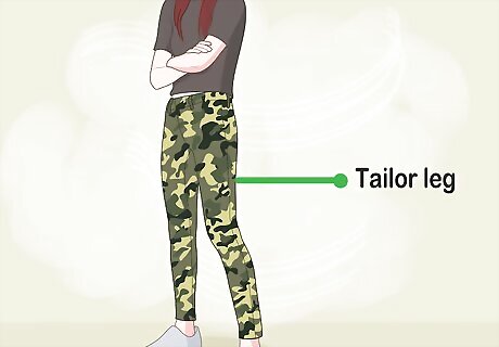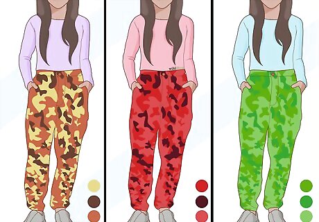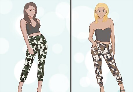 Try a pair of colored camo pants for a bright, fun option. In addition to standard forest green camo, you can buy camo pants in colors like purple, pink, or red. Choose these if you want a unique, bold pair of pants. You can purchase these at streetwear stores or online. Most of these are sized for men, though women can wear them too! Many of these styles offer an adjustable strap on the waistband and ties at the ankle.