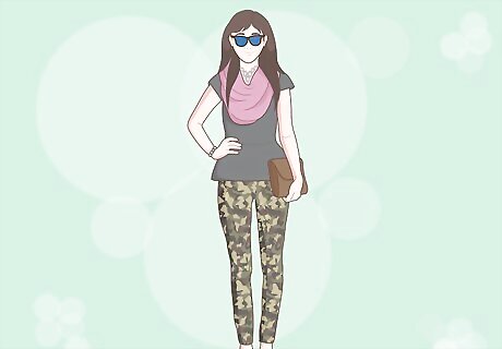 Add jewelry, sunglasses, and scarves to your outfit for a feminine touch. To soften your look, you can add some simple gold or silver earrings, wear a dainty necklace, or strap on a watch. These small touches will tone down any harshness from your camo pants, so you look girly and feminine even in masculine pants. Other accessories include purses. Go with fun colors or minor patterns!