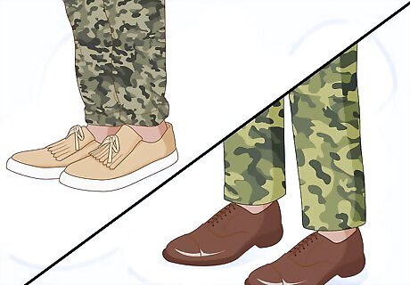 Dress up your camo pants with a pair of dress shoes or heels. To take your look to the next level, throw on a pair of dress shoes, like Brogues or Oxfords, or wear high heels, like pumps or stilettos. With the right pair of shoes, you can wear your camo pants to work or out to the bar. You can also wear boots for a stylish option.