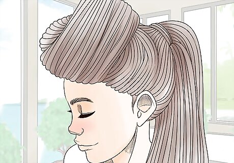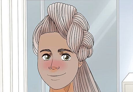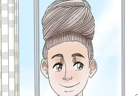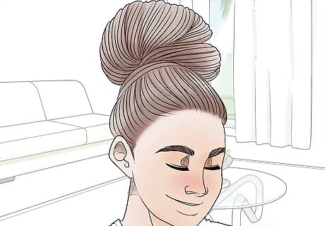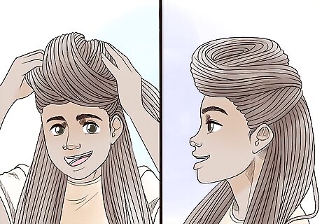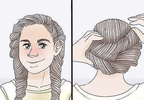 Twist 2 sections together into a knotted bun. Gather your hair into a high ponytail on the very top of your head. Secure it with a hair tie, then split it in half. Twist the first section around the base of the ponytail to make a bun, then secure it with bobby pins. Twist the second section around the bun, but in the opposite direction. Secure it with more bobby pins.