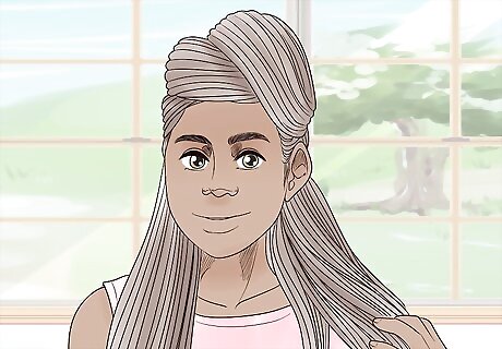 Convert a half-up, half-down ponytail into a double-wrapped turban. Start with a high half-up, half-down ponytail, then split it in half. Cross the left and right sections across your forehead, covering your front hairline. Wrap them around the sides of your head and gather them at the back of your head. Twist them together, tuck them under the wrapped hair, and secure them with a large bobby pin. Use your fingers to sculpt and shape your wrapped hair so that it's as full as you want it to be. Make sure that the left and right sections swoop across your forehead, then sweep up above your ears.