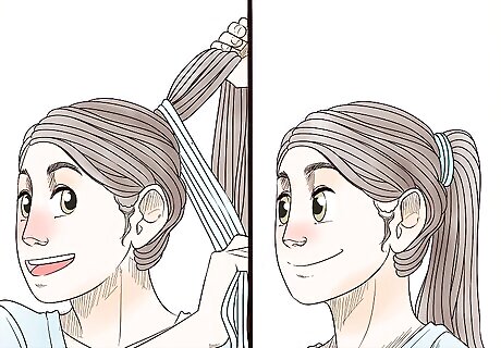 Wrap a half-up, half-down ponytail into a turban. Begin with a high half-up, half-down ponytail. Drape the ponytail across your forehead, then wrap it around the side of your head, keeping it above your ear. Secure it to the back of your head with a large bobby pin. Use your fingers to shape and sculpt your turban into your desired fullness and look. It does not matter which side you wrap the ponytail. Make sure that it is covering your front hairline, however. Braid the ponytail first for a unique look.