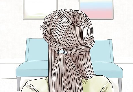 Create a more subtle half-up, half-down style. Section the hair as you would for a half-up, half-down hairdo and create a middle or side part. Take a couple of twists on the left side of your head and twist them together, away from your face, making one large twist. Stop twisting about halfway down and secure it with a rubber band. Repeat these steps with a couple of twists on the right side. Finally, secure the two large twists together with a rubber band.