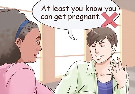 Do not try to make your friend see a bright side. Many people forget that a miscarriage is a loss. Just because the baby was not carried to term does not mean you're friend is not mourning the child. Therefore, avoid comments encouraging your friend to see the bright side. Things like, "Remember, you can always get pregnant again" or "At least you know you can get pregnant" are not helpful during a miscarriage. Your friend likely already knows these things, but they do not make up for the loss.