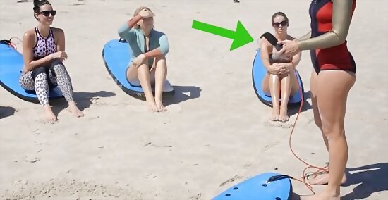 Talk to more experienced surfers or instructors if you can. The best way to practice and prepare for hitting the beach is with another person nearby who knows more about surfing than you do, and can provide feedback and advice. If you have a friend who surfs, ask for help. Friends don't usually charge and you can practice privacy of your own home rather than on the beach in front of others. Pay an instructor. This is the most reliable way to learn the basics of surfing in a clear, methodical way. For a fee, he or she will teach you all you need to know and give you pointers that will help you get out into the surf and having fun quickly.