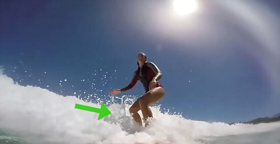 Be prepared to wipe out. If you feel yourself falling, or if the wave dies down, jump away from the board towards the ocean and away from your momentum. A good idea is to fall to the side or the back of the board, covering your head with your arms as you fall. Go with the flow, letting the wave carry you. Swim upwards gently and feel what’s ahead of you to avoid getting hit by the board. Try to land flat so that you won’t injure yourself in shallow water or on a reef. Once you have safely surfaced, pull your leash and climb back onto your board to prevent it from scything or flopping through the water, which can cause serious injury to you or others. Climb aboard, rest on your belly, and regain control. Most wipe out injuries happen as a result of the board hitting the surfer. Always remember to bail to the ocean side of your board. You don't want to be between the beach and your board when a wave has control of the board. If you are riding for the very first time, it's great to rent a foam surfboard rather than a fiberglass one, as they are softer and less likely to cause you injury while learning.