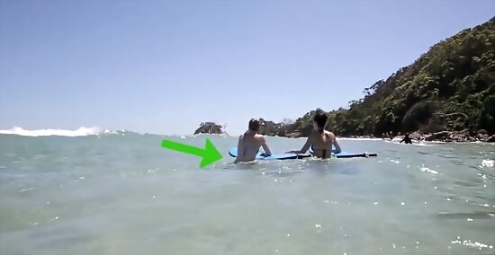 Identify a target spot. You want to be waist deep in the white water, where the waves have already broken. This is the best place to start when you're a beginner. Don't plan on paddling too far out where more advanced surfers might be waiting for a set, but make sure you are in deep enough water to keep from hitting your head if should you fall off your board. Pick a reference point. Choose a landmark on the shore and glance at it periodically as you move into deeper water. This will help you gauge your distance from shore, and can help to reveal any hidden currents that might be moving you.