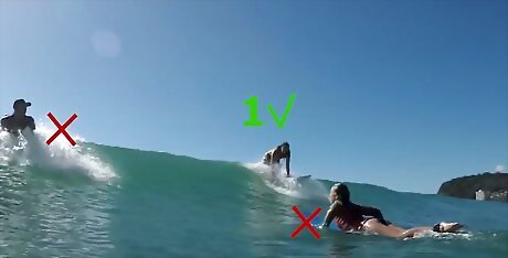 Learn basic surfing etiquette before you head out. Knowing the basic rules of the surf will help you make sure that your first time out is fun and safe. Here are a few basic safety rules to keep in mind: Respect the right of way. When there is more than one surfer paddling to catch a wave, the person who has paddled closest to the peak has the right of way for that wave. Don't "drop in" on others. Paddling to catch or dropping into a wave while someone is already riding closer to the peak is considered rude and potentially dangerous. Remember to scan the line of the wave for other surfers before you try to catch it. Very popular and busy beginner surfing locations don't usually have these strict rules and multiple people will often ride the same wave (sometimes referred to as a "party wave"). If two people are waiting on the same wave, whichever person catches it first and is closer to the peak has the right of way.