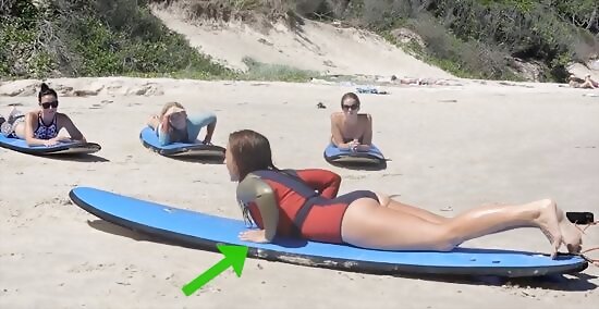 Practice on the ground first. Attach the leash to your back foot and to the tail of your board, then lie belly-down on the board so that your body is lined up straight down the middle of the board. From this position, practice your paddling motion with both arms to get a sense of the muscles that you will be working. If you're right-handed, your back foot will generally be your right foot. This is called "regular" stance. It's called "goofy" stance when the leash is on your left foot. When in doubt, just do what feels most natural. Don't just jump into the water when you're first learning to surf, or you'll get frustrated quickly. Take a little bit of time to practice on the sand, or in the privacy of your backyard, before you're on the beach in front of others.