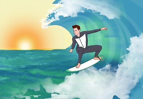 Learn to stand on the board properly. Once you've taken off, keep your knees bent, your arms loose and extended, your feet planted on the board, and your torso leaned forward to lower your center of gravity. Depending on which foot comes naturally in front, you'll be either a "regular foot" or "goofy foot." Regular foot means that your left foot is in front, while goofy foot means your right foot leads. Beginners have a tendency to adopt a squatty stance when learning. Their feet are widely spread apart from bow to stern of their boards. This might feel comfortable, but it actually makes it harder to control. Balance is side-to-side, not front to back. You will notice that experienced surfers usually ride with their feet much closer together. A proper stance includes keeping your eyes looking in the direction you are going.