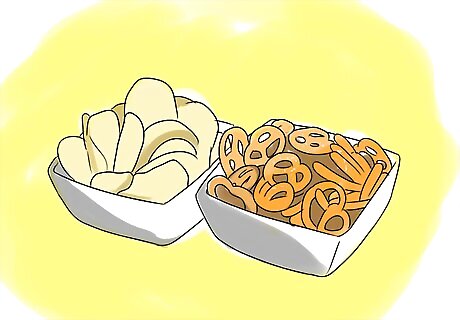 Pack a food bag. This should have small meals, as well as snacks. These can include thing in thermoses, sandwiches and wraps, cold pizza, chips, pretzels, energy bars, crackers, and anything else you like to eat. Also include small deserts, like a box of chocolate truffles. Add some drinks, like water, juice, lemonade, and soda (in insulated water bottles). Finally, add some gum, mints like Mentos and Tic Tacs". Be sure not to bring plastic-throw-away water bottles, especially when you're traveling to a warmer climate; the sun can affect how the water tastes. Survive a Long Road Trip (Teenage Girls) Step 4 Version 2.jpg
