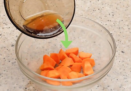 Blend olive oil or butter with maple syrup. Depending on how many root vegetables you're working with, you should mix about ½ cup (170 g) maple syrup with two tablespoons (28.6 g) butter or olive oil for every 2.5 pounds (1 kg) of vegetable. Add salt or pepper according to your usual cooking preferences. You can also experiment with more elaborate glazes, such as ones including chicken broth, garlic powder, honey, or rosemary.