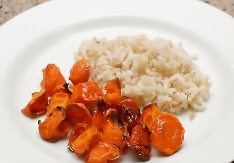Serve vegetables with a grain or protein. Roasted vegetables go well with just about anything, but they pair particularly well with grains, such as quinoa or rice. If you want something a bit heartier, serve them alongside a portion of meat, such as lean red meat, pork chops, grilled chicken, or fish. You can also use your roasted vegetables in a soup, or you can mix them up with eggs for a hearty, healthy omelet!