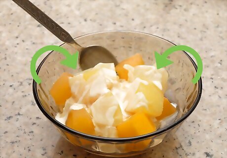Toss a fruit salad with Truvia. This is an excellent technique if some of the fruit for your fruit salad is a little unripe or tart. Add your fruit (like strawberries, grapes, different kinds of melon, and so on) to a large bowl. Drizzle Truvia Nectar on the fruit, then mix it well with clean hands or a mixing spoon. There are many other kinds of salad, fruit salad, or dessert salad that might benefit from a drizzling of Truvia. Some examples include ambrosia, glorified rice, and more.