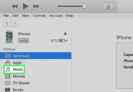 Choose the "Music" tab on the iPhone management screen. The "Music" tab is located directly to the left of the "Summary" tab. If running iTunes 11, the newest version, first visit the "Summary" page of your iPhone management screen and the click the box that says "Automatically sync when this iPhone is connected" in the "Options" box. Be aware that syncing an entire music library will erase the content in the "Music" app on your iPhone and replace it with the contents of the iTunes library your synced it to.