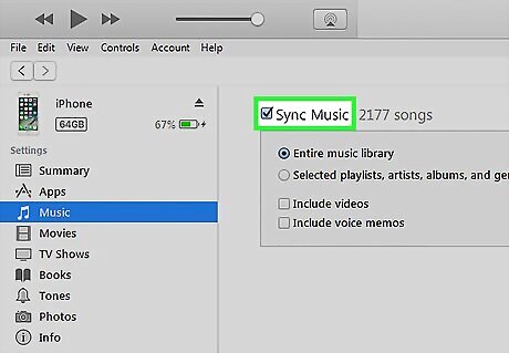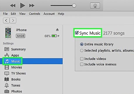 Find the "Sync Music" box and click it so that a blue check mark appears. Again, this box is located in the "Music" tab of your iPhone management screen. Look at the options underneath the "Sync Music" box and choose the function appropriate for your purposes. To sync your entire music library, choose "All songs and playlists." To sync individual playlists, choose the "Selected playlists" option and choose the playlists that you want to sync.