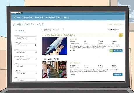 Consider where you should acquire one. Quakers often cost between $50 and $200 to purchase, making them manageable for most interested buyers. Not only the price but the personality of the bird you’re getting may be determined by where you acquire it. Common places include: A responsible breeder. This will cost more than alternatives but is your best bet for getting a loving, hand-fed baby. A parrot rescue. Quakers may not be commonly available here, but if you are lucky, you might be able to find one. You will not get a baby, but the cost will be less, and the parrot will be in a needful and loving home. A shelter. It is unlikely that you will find your quaker here, but check nonetheless. You probably will not have any idea of your Quaker's history if you adopt from here, and the shelter route is only recommended to experienced bird owners. A pet store. Do your homework before considering whether to buy from here. The prices might be cheaper, but you may be getting an unhealthy bird that is less than your money's worth. Not to mention that many pet stores buy their parrots from disreputable sources that use inhumane methods for acquiring and breeding their birds. From the newspaper, online, etc. Some people may be re-homing their Quakers, and this is a fine place to get one, but remember to check that they are not rehoming their parrot because of medical or behavioral issues.