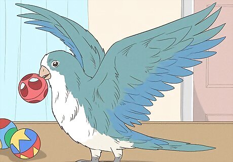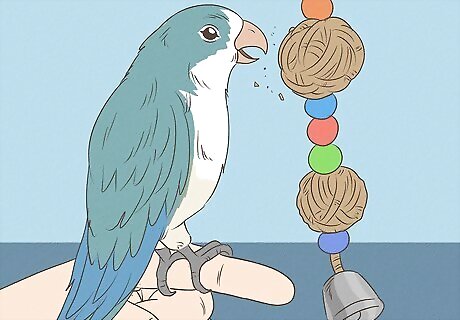 Play with your bird. Quakers need attention and generally love to play, so find time each day to spend engaging your bird’s mind and body. Teach your parrot to “step up” (hop up on your finger when you tap it on the bird’s breast) early on — this is a gateway to other commands, tricks, and games. Provide your quaker with toys and mix them up frequently to keep your parrot engaged. Quakers regularly destroy toys, so you may want to mix in homemade toys, games, and challenges. For instance, something as simple as balling up a treat in a wad of paper can provide your bird with some mental stimulation (at least the first time). Talking is no guarantee with any parrot, but Quakers usually like to talk and take to it easily. Repeating phrases during playtime is an easy way to teach new words, or move up to focused lessons of 10-15 minutes apiece. Keep in mind what Quakers hear from you (or the TV, etc.), however, as they are usually skilled and eager mimics. See also How to Play with a Large Parrot for more play ideas.