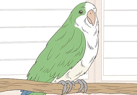Buy the right cage. Quakers are a smaller breed of parrot, but because of their active nature, they do best with a roomy cage. An 18” x 18” x 18” cage should probably be the minimum size for your bird, but also consider safety and security features. Quaker parrots are known for being escape artists, so make sure the bars on the cage are not too far apart, nor at the same time narrow enough that a curious quaker can get its head stuck between them. ⅝-inch spacing between bars is a good reference point. Likewise, to counteract their curiosity and escapability, choose a gate that swings open (not a guillotine-style gate that a quaker may be able to lift up only to have it become a trap). Quakers have been known to figure out how to unlatch a gate, so consider a lock as well.