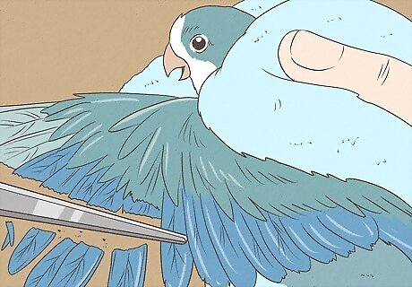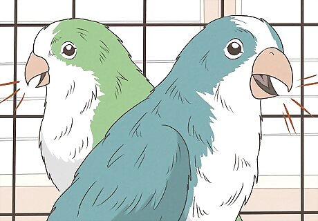 Protect your bird. Because of their mischievous and sometimes reckless nature, you need to take steps to protect your quaker from itself, not just people and other pets. The practice of wing-clipping is controversial. Clipping makes escape less likely and reduces the risk of injury by flying into objects. See How to Clip a Parrot’s Wings or visit your vet for more information. However, the bird's ability to fly is curtailed. This means he gets less exercise and is more likely to feel frustrated. In addition, many birds try to fly but crash land and damage their brisket. These injuries can be quite severe and the thinking is now that wing-clipping is outdated. Instead, adequate training (such as clicker training) is preferred, to control the bird during out of cage time. Some Quakers are fearless (or perhaps foolish) enough to go after cats or dogs, which can result in severe injuries or worse, so take care if you have other pets in the house. The only way to know how they will interact is to let it happen, but be prepared to keep Quakers separated from other pets if necessary. The same goes for other birds as well. Some Quakers thrive with an additional “partner in crime,” others not so much. Exposure at a young age is probably the best bet for success. Exposing your quaker to other people early on is also the best way to keep it from becoming a “one-person bird” who only interacts well with you. It is a two-way street, though, and you may have to instruct people (especially children) how to act around your parrot.