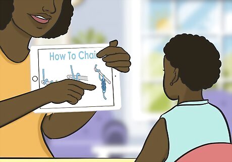 Sit with the child and start crocheting a chain, explaining what you're doing. Sit so that the kids can see your hands and the crochet needle. Make a slip knot, then slowly make a few stitches, clearly explaining each individual motion. Tell the child how to hold the yarn, including how to control the tension with their index finger. and repeat the stitch a few times until you feel like they have a good idea for what you’re doing. Speak slowly and clearly, and pause often to make sure the child understands what you’re telling them. Sitting side-by-side will make it easier for the child to see what you’re doing.