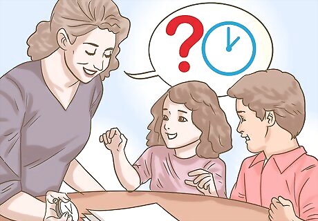 Ask questions related to keeping track of time. When you begin teaching your child to count and tell time, introduce them to duration. Explain what a minute is and count with them to 60. Try playing with a kitchen timer or stopwatch to help them learn lengths of time, such as 5, 15, and 30 minutes. Have them use the timer to keep track of how long activities last. Build on their understanding of duration by asking, “How long is your favorite TV show?” or “How long did it take to brush your teeth?” Introducing them to duration will help them accurately estimate how long a task will take later in life.