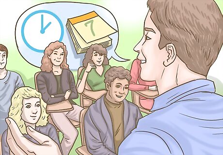 Explain how to develop daily and weekly schedules. Tell your time management students to structure their time using an electronic or paper planner. Advise them to start by planning out their short-term tasks. Show school students how to budget time each day for homework. For instance, on a Monday, they might do math homework from 4:00 to 4:45, study for history from 5:00 to 6:00, have dinner, then draft an essay from 7:00 to 8:00. Professionals should similarly plan their daily tasks, which vary widely by industry. For example, a product designer might check and respond to emails from 8:30 to 8:50, have a conference call from 9:00 to 9:30, and draft blueprints from 9:30 to 12:00.