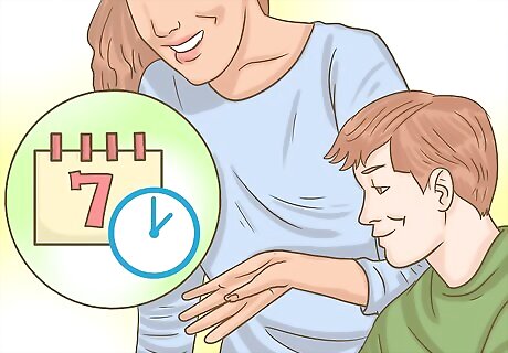 Stick to a predictable routine. A routine can help your child develop their awareness of time. In addition to structuring their time, reinforce their understanding by telling them when and where activities happen. For example, tell your preschooler, “You go to school on Mondays and Wednesdays,” “It’s 2:00 p.m. so it’s time for a nap,” or “at 7:30 p.m. we brush our teeth, at 7:45 p.m we read a story, and at 8:00 p.m. we go to bed.” Once you’ve established a schedule, begin asking them which activities come next. Ask, “We just brushed our teeth, so what comes next?” or “Today is Monday. What happens on Mondays?”