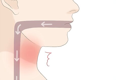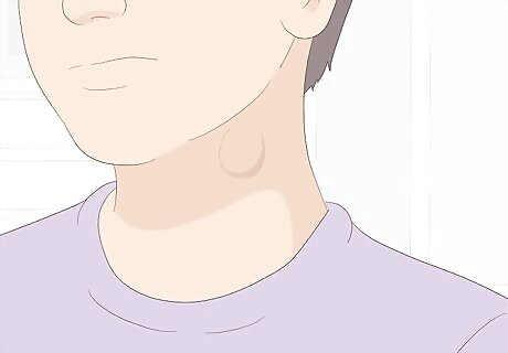 Feel the glands in your neck. Lymph nodes trap and destroy germs. The lymph nodes in your neck will usually be swollen and tender to the touch if you have strep throat. While lymph nodes are located in various parts of your body, the first nodes to swell are usually those that are nearest to the source of infection. In the case of strep throat, the lymph nodes in and around your throat will be the ones to swell. Use your fingertips to gently feel the area directly in front of your ear. Move your fingertips in a circular motion behind your ear. Also check the area of your throat just below the chin. The most common site of lymph node swelling with strep throat is under your jaw, about midway between your chin and your ear. Move your fingertips back and up toward the ear, then down the side of the neck below the ear. Finish by checking the collarbone and repeating on both sides. If you can feel notable swelling or bulging in any of these areas, your lymph nodes might be swollen due to strep.