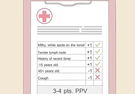 Expect your doctor to go through a clinical diagnosis protocol. This protocol is basically an organized way for your doctor to assess your symptoms. For adults, your doctor may use what is known as a Modified Centor Clinical Prediction Rule in order to empirically indicate how likely it is that you have a group A Streptococcal infection. This is simply a list of criteria that the doctor checks for to determine whether (and how) you should be treated for strep throat. The doctor will tally points, positive or negative, for signs and symptoms: +1 point for milky, white spots on the tonsils (tonsillar exudates), +1 point for tender lymph nodes (tender anterior chain cervical adenopathy), +1 point for a history of recent fever, +1 point for less than 15 years of age, +0 point for an age between 15-45 years old, -1 point for being greater than 45 years old, and -1 point for a cough. If you score 3-4 points, then there is a positive predictive value (PPV) of roughly 80% that you have a group A streptococcal infection. Basically, you are considered positive for strep. This infection should be treated with antibiotics and your doctor will prescribe the proper regimen.