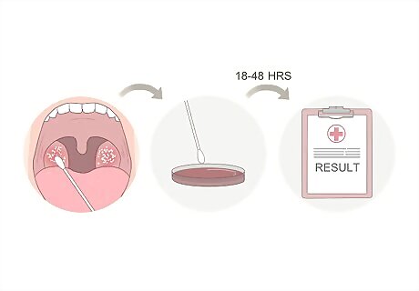 Ask the doctor for a throat culture. If the results of your rapid strep test are negative but you still exhibit other strep throat symptoms, the doctor may want to administer a longer test known as a throat culture. A throat culture will attempt to colonize bacteria outside of your throat in a lab. As the bacteria colony collected from your throat grows, it will become easier to detect larger amounts of group A streptococcus bacteria. Your doctor will likely use any combination of the Centor criteria, rapid strep test, and throat culture, depending on his or her clinical judgment. While rapid strep tests alone are usually enough to determine whether or not a strep infection is present, false-negatives have been known to occur. Throat cultures, by comparison, are more accurate. A throat culture is not needed if the rapid strep test comes back positive, as the rapid strep test directly tests for antigens to the bacteria and will only test positive if a threshold level of bacteria are present. This would indicate immediate treatment with antibiotics. The doctor will use a cotton swab to collect a sample of fluids from the back of your throat. The doctor will send the swab to a lab and the lab will transfer that sample to an agar plate. The plate will incubate for 18-48 hours depending on the methodology of the specific lab. If you have strep throat, then group A streptococcus bacteria will grow in the dish.