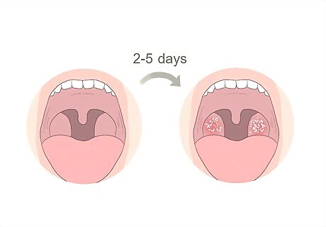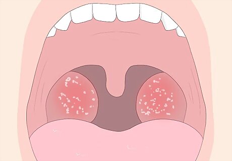 Check your tonsils if you still have them. Strep throat will usually cause your tonsils to become inflamed. They will appear a brighter or deeper red than usual and will be notably enlarged. You may also notice that the tonsils are coated in patches of white. These patches of white can be located directly on the tonsils or simply in the back of the throat. They can also appear yellow instead of white. Instead of white patches, you may notice long streaks of white pus coating your tonsils. This is also a symptom of strep throat.