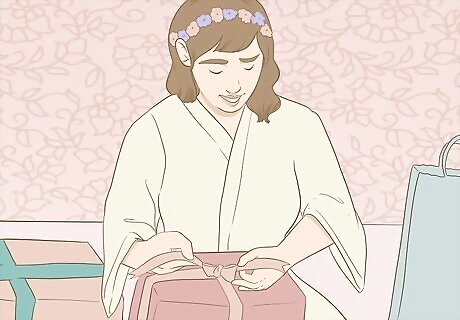 Set a time for the bride to open her gifts. One of the main events at any bridal shower is the bride receiving all of her presents. Let your guests enjoy the spa for about 1 hour, and then gather them around the bride in a large area or waiting room to watch her open them. Talk to the bride beforehand to see if she wants you to write down who gave her what to send thank you notes. Opening the presents after 1 hour also accounts for guests who might show up late.