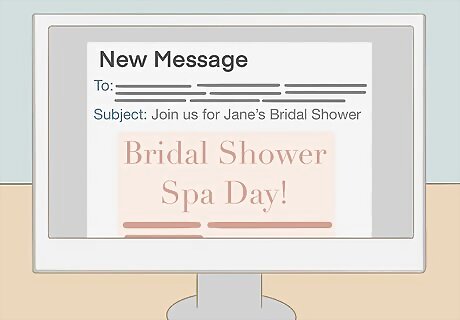 Send invitations to your guests 2 months in advance. Contact everyone on your guest list with the date and time of the shower. You can send them paper invitations, send a mass email, or use social media to give out your invitations. Ask your guests to let you know if they will be able to make it so that you can plan accordingly. Incorporate the spa theme into your invitations by using pictures of bathtubs, suds, and bubbles. You can create an event page on Facebook for an easy way to see how many people will be attending. Your guests can choose “Going,” “Maybe,” or “Can’t Go” to RSVP. Be sure to include information about the bride’s gift registry if she has one.