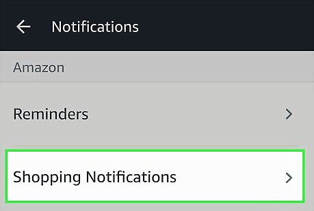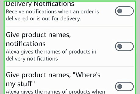Toggle 'ON' the Notification options. Tap the switch to toggle each of the notification options to the 'ON' position. The switch is ON when it's blue and OFF when it's gray and white. Turn on the following notification options: Delivery Notifications: Toggle On to get Alexa notifications when a package is out for delivery and when it is delivered. You will hear a chime and Alexa's ring will pulse yellow. Give product names, notifications: Toggle On to hear what products are in the package when you listen to a tracking notification. Give product names, "Where's my stuff": Toggle On to hear what products are in the package when you ask, "Alexa, where's my stuff?" or "Alexa, track my order." Reorder notifications: Toggle On to get notifications about reordering products you have ordered in the past.