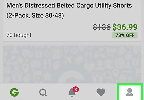 Tap on My Stuff in the bottom menu. From the Groupon homepage, locate the “My Stuff” tab on the bottom navigation menu. This tab has an icon of a person.