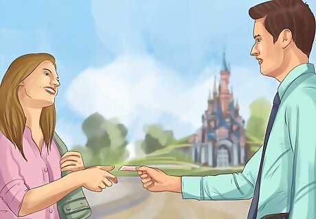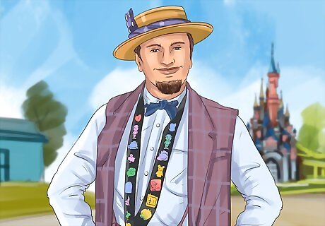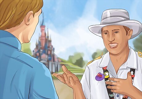 Look for guests wearing acceptable pins to trade. Other park guests may be wearing Disney pins for trade on a lanyard, hat, or jacket. If you see another guest with Disney pins visible, wave to them and show them your Disney pins as you approach them.