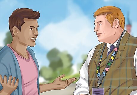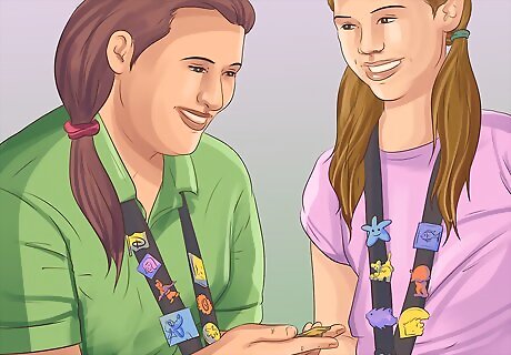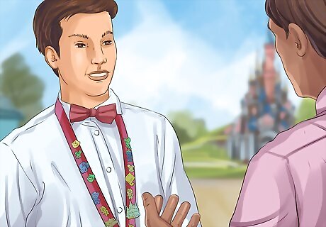 Approach the guest and politely ask if they’re willing to trade pins. First ask the guest, “Do you have any pins you’re interested in trading?” If their answer is yes, kindly ask them, “Can I please see your pins?” while holding your pins in plain view for them to look at. Avoid reaching out and touching another person’s pins or lanyards. Always respect personal boundaries and simply look at their pins while they look at yours.