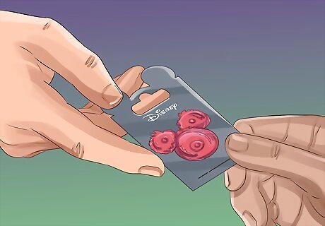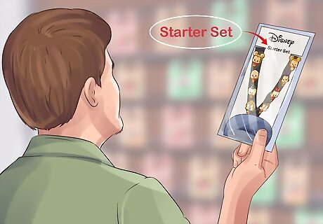 Buy a starter set at a Disney park if you want to see the pins in person. Trading pin starter sets are sold at Disney theme park stores. The starter sets usually include 4 pins and a lanyard for $24.95. Pins are also sold individually in stores, though they are around $6.95-$19.95 each, so getting a starter pack can be a better deal. Some Disney stores also offer mystery bags of pins at a discounted price. This is also a good option since the goal is to trade pins, and the ones you get in the bag don’t necessarily have to be ones that you like.