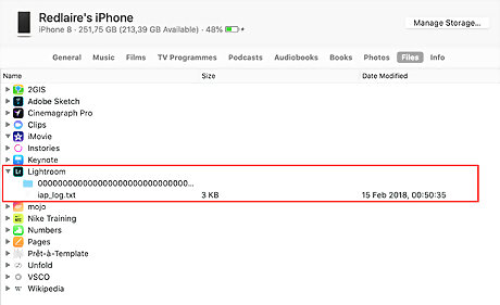 Click the expansion triangle beside an app name to see the files on your iPhone.