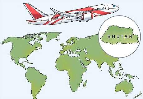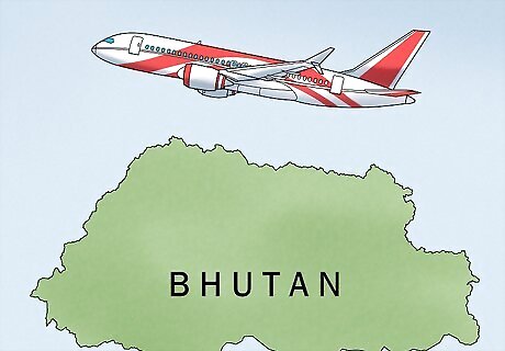 Fly directly into Bhutan. There is only one international airport in the country. It is in a city called Paro, which is one hour away from Thimphu, the capital of Bhutan. Only three airlines, Drukair, Bhutan Airlines and Buddha Air, fly into Bhutan. Buddha Air only does charter flights. Flights to Bhutan depart from Nepal, India, Bangladesh, Singapore, and Thailand year-round as well as from Malaysia and Indonesia during peak tourism months. Drukair offers flights from places like Dhaka, Bangladesh; Delhi, India; Kathmandu, Nepal and Bangkok, Thailand.