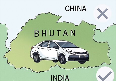 Enter Bhutan by land. This is only possible by going through India, meaning you’ll have to take a flight to India and then cross into Bhutan. You cannot enter Bhutan by land through Tibet or China. There are three land border areas open to tourists: Phuentsholing, Gelephu, and Samdrup Jongkhar. Phuentsholing is a little more than 100 miles from Bagdogra, India, where there is an international airport. Once you arrive at Phuentsholing, it takes about six hours to get to Thimpu. Gelephu and Samdrup Jongkhar are somewhat close to the Indian state Assam. The capital of Assam is Guwahati, which has an international airport. Guwahati is about 140 miles from Gelephu and less than 100 miles from Samdrup Jongkhar. If you are travelling through Guwahati, try to cross the border at Samdrup Jongkhar, as it is about a three-hour drive. You can get to Bhutan from India by bus or private car. There is no direct train route to Bhutan from India.