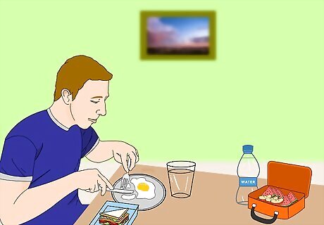 Eat a light meal. Travel anxiety could distract you from eating well before your flight, but traveling while hungry will amplify your anxiety. On the other hand, a large meal may leave you feeling bloated, tired, or even sick in a confined space. Eat a light meal before you leave so you’re comfortable. Dehydration can exacerbate anxiety. Drink water beforehand and bring a bottle with you on your trip. If you are flying, you’ll need to buy the water at the airport past the security checkpoint. Sliced fruit, yogurt, baby carrots, celery, and nuts are great options to provide healthy energy for your trip. These foods are also relatively easy to take with you to eat during the trip. Avoid foods that might give you gas or bloating. These include dairy products, bran, legumes like beans or lentils, and cruciferous vegetables like asparagus, broccoli, cabbage, artichokes or onions. You should also avoid anything with a lot of grease, trans fat, or sugar.