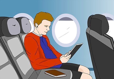 Plan activities. One of the best ways to deal with travel anxiety is to simply take your mind off it. Have some work, school, or recreational activities planned so that you’re distracted from whatever is making you anxious about the trip. Practicing art or writing is a great way to distract yourself from your anxiety during a trip. Bring along a loose-leaf journal with plenty of paper. Try sketching or writing a creative story. Crossword puzzles, Sudoku, and other games are popular options for passing time during travel. Read exciting or compelling books to help you disconnect from anxiety triggers around you. If you get motion sick, try audio books with headphones. Calming music or guided meditations on your phone or music device can aid in relaxation. Invest in some comfortable earbuds or headphones. Taking along a laptop or portable gaming device will greatly expand your options. Have some games or tasks you can complete available offline in case Wi-Fi isn’t available for your trip.