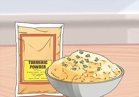 Add turmeric to your food. Turmeric is probably best known as a food additive and spice. It is used to turn foods yellow, including curries and mustard, and has a subtle, slightly bitter taste. Try adding it to your favorite recipes to incorporate it into your diet. Add a pinch of black pepper whenever you cook with turmeric. The pepper will boost the beneficial effects of the turmeric. One food that turmeric can easily be added to is rice. If using 1 cup (237 ml) of uncooked rice, add between 1/2 and 1 tablespoon (7-15 ml) of turmeric powder to the rice before cooking, depending on the level of flavor and color you desire. The turmeric will turn the rice a bright yellow and will give it a wonderful flavor.