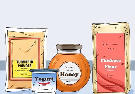 Pick a recipe or create your own. There are a variety of turmeric mask recipes that can be used on your face. These combine turmeric with ingredients that will both help your skin and help the turmeric stick to your skin. Common ingredients for a turmeric face mask include: honey, yogurt, milk, avocado, oat or chickpea flour, and lemon. One recipe you can use is to combine 2 tablespoons (30 ml) of chickpea flour, a quarter teaspoon (1 ml) of turmeric powder, 2 teaspoons (30 ml) of honey, and enough yogurt, milk, or water to make the mixture into a paste. For a really simple mask, simply combine a quarter teaspoon (1 ml) turmeric with 2 tablespoons (30 ml) of honey. This mixture is easily applied to the face due to the stickiness of the honey. For skin that is dry but also prone to breakouts, combine 1 tablespoon (15 ml) of turmeric with half a mashed avocado. Make your own special combination if you like! If you have any of the ingredients normally used in face masks on hand, simply combine what you have and use it.