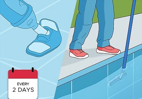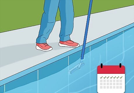 Brush, vacuum, and filter the pool regularly. A well-maintained pool with good filtration and circulation is much less likely to get algae than one that's not cleaned regularly, that isn't filtered properly, and that doesn't have good water circulation. The pump and filter should run between eight and 12 hours a day during pool season. Brush and vacuum the pool every two days. Clean and sanitize pool equipment and toys every one to two weeks.