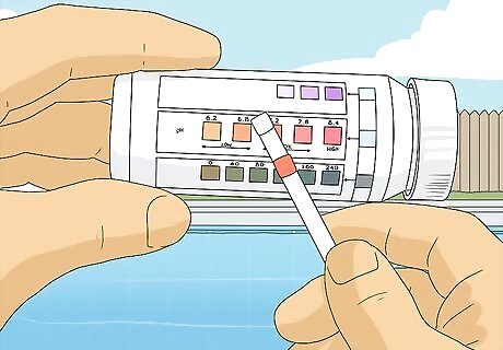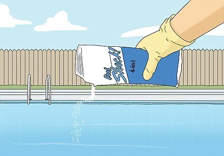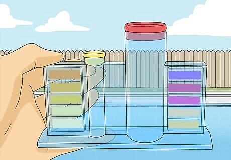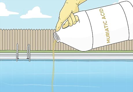 Test and adjust the water pH. When the pH of pool water gets too high, it prevents chlorine from being effective, meaning it can't prevent or treat an algae bloom. Add pool water to a test kit and test the pH of the water. Lower the pH by adding muriatic acid or sodium bisulphate. Increase the pH by adding sodium carbonate. Test the water again after treating it. The ideal pH is between 7.2 and 7.6.